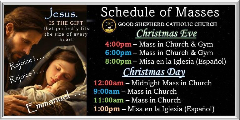 We the Catholic Church of the Good Shepherd, a Eucharistic Community guided by the Holy Spirit and the love for the Lord Jesus Christ, seek to glorify the Kingdom of God in worship, prayer, fellowship, service, learning, and living His Word.
