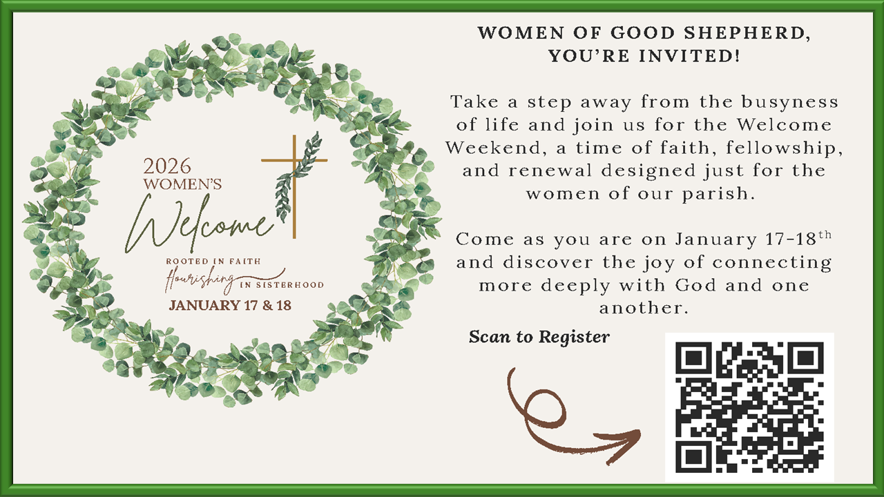 We the Catholic Church of the Good Shepherd, a Eucharistic Community guided by the Holy Spirit and the love for the Lord Jesus Christ, seek to glorify the Kingdom of God in worship, prayer, fellowship, service, learning, and living His Word.